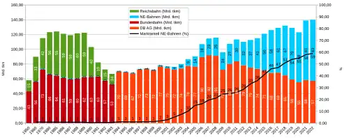 Der Anteil privater Bahnen an den Zugleistungen im Personennahverkehr erhöhte sich von 3 % auf 33 % (2017). Die Fahrgastzahlen insgesamt stiegen von 1,36 Milliarden (1993) über 2,21 Milliarden (2008) auf 2,75 Milliarden (2017) und verdoppelten sich somit seit 1993.[19][20][21] Bei den 2013 durchgeführten Vergaben im Umfang von 53 Millionen Zugkilometern errangen die Unternehmen im DB-Konzern 72 %. Im Jahr 2012 wurden 51 Millionen Zugkilometer per Ausschreibung vergeben, wobei die DB 45 % gewinnen konnte. Die größten Konkurrenten der DB im SPNV sind Transdev, Netinera, Benex, Abellio und Keolis.[20]