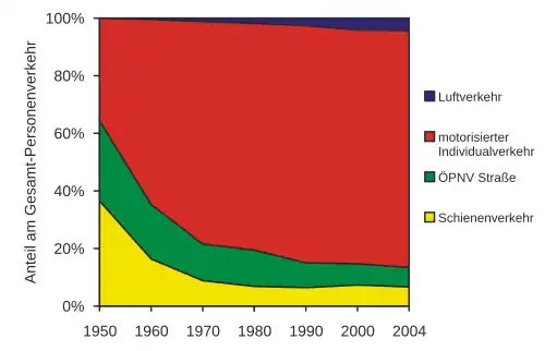Im Bereich der Deutschen Demokratischen Republik genoss die Deutsche Reichsbahn eine monopolartige Stellung, so dass sie ihren außerordentlich großen Anteil am Transportmarkt bis 1989 behaupten konnte. Auch wurde gerade im Güterverkehr bewusst auf die Schiene gesetzt, um knappes Erdöl durch heimische Braunkohle zu ersetzen – so mussten alle Transporte über 50 km auf der Schiene erfolgen. Allerdings sorgten Material- und Personalmangel zu einer ungenügenden Erhaltung der Infrastruktur, zumal das Eisenbahnnetz nach 1945 durch Reparationsleistungen an die Sowjetunion beträchtlich in Mitleidenschaft gezogen worden war. Nach der Wiedervereinigung und dem Niedergang der DDR-Wirtschaft brachen die Transportleistungen vor allem im Güterverkehr stark ein. 1990 wurde zur Sanierung der Reichsbahn innerhalb der folgenden zehn Jahre ein Finanzbedarf von 100 Milliarden DM veranschlagt.[2]
