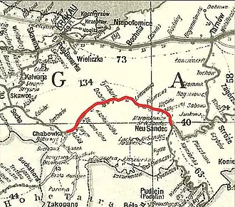 Nach dem Überfall auf Polen lag die Strecke ab September 1939 im durch Deutschland besetzten Generalgouvernement. Betreiber der Strecke war bis zur Befreiung des Gebietes durch die Rote Armee im Januar 1945 die Generaldirektion der Ostbahn (Gedob). Der Sommerfahrplan 1941 verzeichnete vier durchlaufende Personenzugpaare von Chabowka nach Neu Sandez. Dazu kam ein Weiteres auf der Teilstrecke zwischen Limanowa und Neu Sandez.[5]