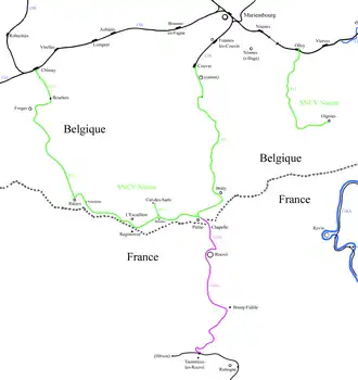 ![]() Ehemaliger Streckenverlauf (lila) ![]() Fahrplan der Chemins de fer départementaux des Ardennes, Mai 1914[1] | |||||||||||||||||||||||||||||||||||||||||||||||||||||||||||||