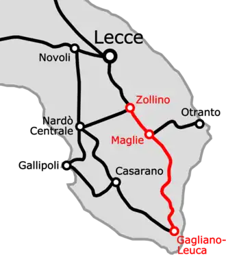 Am 2. Mai 1865 nahm die Società Italiana per le Strade Ferrate Meridionali den Betrieb auf der Adriabahn bis Brindisi, am 15. Januar 1866 bis Lecce und am 1. Februar 1868 bis Maglie auf, um ab dem 22. September 1872 ihren Endpunkt Otranto zu erreichen.[1] Als die großen Bahngesellschaften in Italien 1905 verstaatlicht und in den Ferrovie dello Stato zusammengefasst wurden, umfasste das die Strecke Bologna–Otranto und damit den Abschnitt Zollino–Maglie der heutigen Strecke Zollino–Gagliano Leuca.