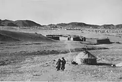 Blick auf das Sommerlager der „Hauptstadt“ Bǎilíngmiào (百靈廟, W.-G. Pai-ling-miao, mongolisch Bat Chaalga oder Bathahalak) 1934. Der namensgebende Tempel im Hintergrund.