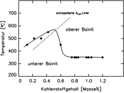 Ein weiterer umstrittener Aspekt der Bainitbildung ist die Übergangstemperatur vom unteren zum oberen Bainit. Man geht davon aus, dass diese – wie in Bild 10 gezeigt – mit steigenden Kohlenstoffgehalten von 400 °C auf etwa 550 °C bei 0,5 Masse-% C ansteigt. Bei weiter steigenden Kohlenstoffgehalten stellt sich bei gleichbleibender Umwandlungsgeschwindigkeit eine höhere Übersättigung des gebildeten Ferrits ein, so dass der Kohlenstoff immer langsamer in den Austenit abdiffundiert. Entsprechend werden immer höhere Umwandlungstemperaturen für eine hinreichende Kohlenstoffdiffusion in den Austenit benötigt, damit sich dort Carbidausscheidungen bilden können. Überschreitet der Zustand der Legierung die extrapolierte Acm-Linie des Fe-Fe3C-Diagramms, so wird die Legierung quasi übereutektoid und es kommt zur Carbidausscheidung aus dem Austenit, was der Bildung des oberen Bainits entspricht. Deshalb sinkt die Übergangstemperatur oberhalb 0,7 Masse-% C auf 350 °C ab. Unterhalb dieser Temperatur verläuft die Carbidausscheidung aus dem Austenit langsamer als die aus dem Ferrit und es bildet sich unterer Bainit.