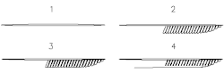 Bei dem von Spanos, Fang und Aaronson entwickelten Mechanismus der Carbidbildung wird, wie in Bild 9 skizziert, von langen Ferritkeimen (1) ausgegangen, an denen im zweiten Schritt durch sympathetische Keimbildung weitere Ferriteinheiten entstehen (2).[31] Der zwischen den Ferriteinheiten eingeschlossene Austenit reichert sich durch Diffusion aus dem Ferrit stark an Kohlenstoff an, bis es zur Carbidbildung aus dem Austenit kommt (3). Im letzten Schritt schließen sich die Lücken um die Carbide, da nunmehr weitere Ferritbildung in den – jetzt an Kohlenstoff verarmten – Austenitbereichen erfolgen kann. Wandernde Kleinwinkelkorngrenzen gleichen vorhandene Orientierungsunterschiede zwischen den Ferriteinheiten aus, so dass ihre ehemaligen Begrenzungen nahezu verschwinden (4).
