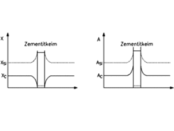 Silizium ist in Zementit praktisch unlöslich. Das Wachstum eines Zementitkeimes setzt also die Abdiffusion von Silizium voraus, die bei den Umwandlungstemperaturen der Bainitbildung nur sehr langsam erfolgen kann. Um den Zementitkeim baut sich ein Siliziumgradient auf, der lokal die Aktivität des Kohlenstoffs stark erhöht (vgl. Bild 16).[44] Dadurch wird der Kohlenstoffzufluss zum Zementitkeim reduziert, so dass der Keim nicht weiter wachsen kann.