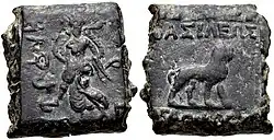 um 190–180 v. Chr. (Agathokles) | Legierung | Göttin Subhadra mit Blume in der Hand, nach links schreitend. Brahmi-Inschrift | Panther nach rechts. Griechische Inschrift. | British Museum: Coin,1844,0909.61 |