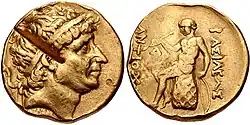 261–256 v. Chr. (Antiochos II. Theos) | Stater | Gold | Herrscherbildnis mit Diadem nach rechts | Apollon auf Omphalos sitzend, einen Pfeil prüfend, während die andere Hand auf dem Bogen ruht | Seleucid Coins Online (part 1) 616 |
