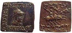 Die indo-griechische Währung wurde südlich des Hindukusch verwendet. Die Inschriften waren zweisprachig: griechisch auf der Vorderseite und Kharoshthi-Schrift oder Brahmi-Schrift auf der Rückseite. Tetradrachmen, Drachmen und Hemidrachmen folgten lokalem indischem Gewichtsstandard. Die rechteckigen Bronzemünzen zeigten unter anderem Bilder hinduistischer Gottheiten. Jüngere Tetradrachmen und Drachmen sind ebenfalls rechteckig.[1]