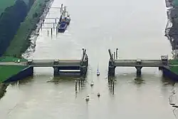 - Das von 1964 bis 1968 errichtete Ostesperrwerk besteht aus Massivbauteilen mit ca. 20.000 Kubikmeter Beton. Die Schifffahrtsöffnung in der Mitte misst 22 Meter und kann bei Sturmflut durch stählerne Stemmtore geschlossen werden. Damit Schiffe die Brücke des Sperrwerks passieren können, ist deren mittlere Teil als Klappbrücke ausgeführt.[7]