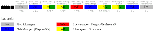 - Als dritter Zugteil wurden in Wien Wagen aus Straßburg über Stuttgart und München beigestellt. Aufgrund schwacher Nachfrage wurde dieser Zugteil aber bereits im Juni 1917 auf den Laufweg ab München verkürzt. Ab Mai 1918 soll zudem ein Kurswagen von Würzburg nach Wien eingesetzt worden sein.[5]