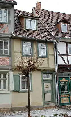 Das kleine zweigeschossige Fachwerkhaus stammt aus der Zeit um das Jahr 1700. Im Quedlinburger Denkmalverzeichnis ist es als Wohnhaus eingetragen. Es ist lediglich vier Gebinde breit und weist an seiner Fassade die typischen Zierformen der Bauzeit auf. So finden sich am Fachwerk Pyramidenbalkenköpfe und profilierte Füllhölzer. In der Zeit des Klassizismus wurde das Untergeschoss umgestaltet. Aus dieser Zeit stammt die Haustür des Gebäudes.