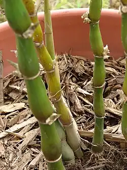 Davon abweichend werden meist bei Topfpflanzen nur 25 bis 50 Zentimeter lange und 1 bis 2 Zentimeter dicke Halme mit verkürzten und an der Basis verdickten Internodien gebildet. Äste werden nur an den höher liegenden Knoten gebildet, die meist einzeln stehen, keine Dornen bilden und ebenfalls verkürzte und verdickte Internodien aufweisen.[1]