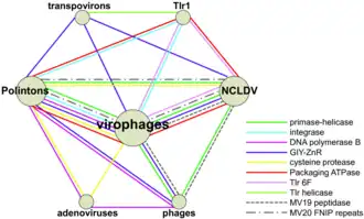 Das genetische Netzwerk, das verschiedene Gruppen der Bamfordvirae und eigennützige genetische Elemente (selfish genetic elements) verbindet. Die Verbindungen zwischen den Knoten sind farblich durch das Gen gekennzeichnet, dessen Sequenzhomologie die Verbindung herstellt.[A. 1][7]