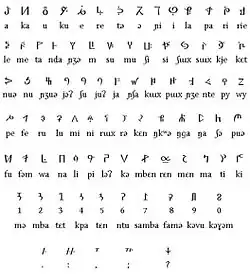 2006 initiierte das B.S.A.P.P. die Entwicklung von Textverarbeitungsschriftarten für diese Schriftsysteme[3] mit A-Ka-U-Ku als Referenzsystem, da es am meisten verwendet wurde und in ihm die meisten publizierten Texte vorliegen. Zu seiner Ausarbeitung werden insbesondere die Dokumente von König Njoya und seiner Mitarbeiter Nji Mama und Njoya Ibrahimou herangezogen.