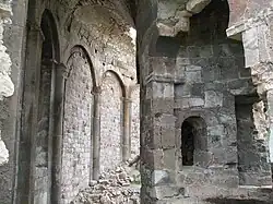 Die Säulen der Ostapsis schlossen oben über einem umlaufenden Flechtkranz mit einem ionischen Kapitell ab, das hufeisenförmige Arkaden mit einem Blendbogen darüber stützte. Die bauplastische Gestaltung an den Außenwänden scheint sparsam gewesen zu sein. Die erhaltenen Blendbögen bestanden einheitlich aus einer oberen vorkragenden Steinreihe und einer zweiten, zurückgesetzten Reihe darunter. Beide waren sorgfältig geglättet, aber bis auf die Bögen an der Ostseite nicht ornamentiert. Wie auf Fotografien von 1902 zu sehen ist, fanden sich dort in den Bogenzwickeln gewundene Weinranken, die aus einer Vase emporwuchsen und drei in einem Dreieck angeordnete Granatäpfel und seitlich davon Weintrauben umgaben. Farbspuren zufolge dürften die Ornamente in den Zwickeln violett bemalt gewesen sein.