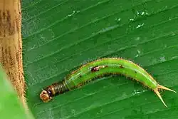 Die Raupen haben die typischen Merkmale der Tribus Brassolini, eine Kopfkapsel mit mehreren, teilweise verzweigten, Dornen und einen auffällig gegabelten Schwanz. Auf dem Rücken befinden sich mehrere kurze dreieckige Stacheln, was sie von den ähnlichen Raupen der Gattung Opsiphanes unterscheidet. In den ersten Stadien sind die Raupen grün, später färben sie sich braun. Im letzten Stadium können sie ein Gewicht von 16 Gramm erreichen.