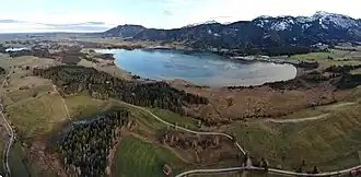 | Bannwaldsee von Westen, im Hintergrund die Ammergauer Alpen. | ||