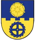 Seit 1. Juli 2003 gibt es ein offizielles Ortswappen. Heraldische Beschreibung: Im Blau-Gold (Blau-Gelb) durch Zinnenschnitt geteilten Schild oben eine Rose, unten ein Wassermühlrad in gewechselten Farben. Das vorliegende Wappen weist fünf Bezüge zu Geschichte, Gegenwart und Zukunft des Ortes auf: