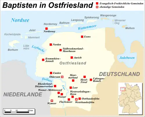 Im Landkreis Leer bestehen insgesamt acht selbstständige Baptistengemeinden und zwei Zweigstellen. Damit befinden sich hier mehr als die Hälfte der ostfriesischen Baptistengemeinden. Der Anteil der Baptisten an der Gesamtbevölkerung des Landkreises beläuft sich auf 0,83 %. In keiner anderen Region Deutschlands sind die Baptisten stärker vertreten.[3] Eine Besonderheit stellen im Landkreis Leer die Baptistengemeinden Firrel und Remels dar. Während alle anderen Gemeinden dieser Freikirche an den Körperschaftsrechten des Bundes Evangelisch-Freikirchlicher Gemeinden partizipieren, haben die genannten Gemeinden, die bis 2004 Teilgemeinden der Baptistengemeinde Firrel-Remels waren, eigene Körperschaftsrechte, die ihnen 1985 vom Niedersächsischen Kultusministerium verliehen wurden. Nach ihrer organisatorischen Trennung erhielten beide nunmehr selbständige Ortsgemeinden eigene Körperschaftsrechte.[11]