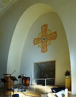 Nach Umbaumaßnahmen im Jahr 1984, erfolgte 1988 die künstlerische Neugestaltung des Gottesdienstraumes. Farbgebung und Wandmalerei sind ein Werk des abstrakten Malers Georges Beauducel (1929–2020).[3]