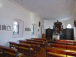 Im Innenraum befindet sich ein barocker Hochaltar aus dem 17. Jahrhundert. Ihn schmücken drei Heiligenfiguren. Links ist Johannes der Täufer zu sehen, in der Mitte eine Muttergottesfigur und rechts die hl. Barbara von Nikomedien. Des Weiteren befinden sich noch zwei weitere Heiligenfiguren in der Kapelle, die die hl. Katharina von Alexandrien und die hl. Lucia von Syrakus darstellen. Alle Figuren wurden um 1990 von der Südtiroler Bildhauerwerkstatt Senoner aus Wolkenstein in Gröden als Nachbildungen für 1989 gestohlene Figuren aus dem 17. Jahrhundert geschaffen.[1]