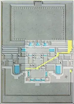 Das Thermengebäude mit einer Größe von 172 m × 96 m war entlang einer von Norden nach Süden verlaufenden Achse geplant, wobei die beiden weitgehend identischen Badetrakte spiegelsymmetrisch links und rechts der Achse lagen. Der langen Eingangsfront im Norden war der große Hof der Palaestra vorgelagert, die durch eine Portikus begrenzt war.[5]