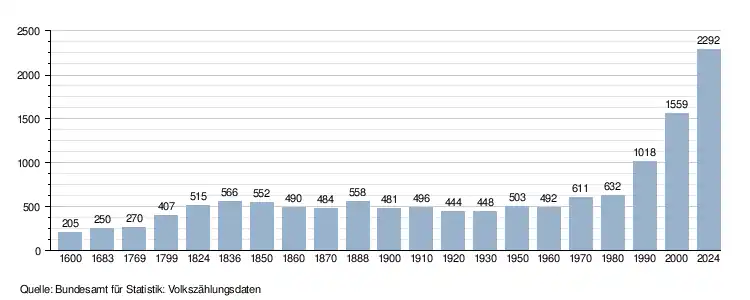 - ↑ Daten der Eidgenössischen Volkszählungen ab 1850 nach Gemeinden. (XLSX; 10 MB) Bundesamt für Statistik, Neuchâtel, 12. Juli 2024, abgerufen am 11. Februar 2025 (Öffnung in Excel nur über "Anhang/Excel-Datensatz" möglich).