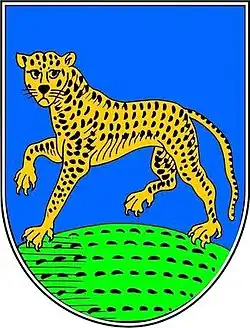 Blasonierung: Das Wappen der Gemeinde zeigt in blau auf grünem Boden einen (nach heraldisch) rechts gewandten natürlich schreitenden, gelb und schwarz gefleckten Leoparden.