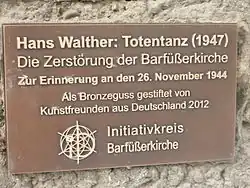 Ende November 2012 brachte der „Initiativkreis Barfüßerkirche“ ein auf der Basis eines wiedergefundenen Gipsabdrucks neu gegossenes Bronzerelief Totentanz von Hans Walther (1947) an der Außenmauer vor der Ruine der Barfüßerkirche an, mit erklärender benachbarter Tafel: „Gestiftet von Kulturfreunden aus Deutschland“.[16]