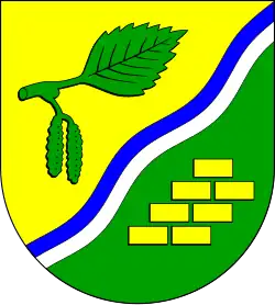 Beschreibung des Wappens: „Von Gold und Grün durch einen blauen und silbernen Wellenbalken schräglinks geteilt, oben ein grünes schräglinkes Birkenblatt mit Fruchtstand, unten sieben goldene 1 : 2 : 2 : 2 gestellte Ziegelsteine.“[9]