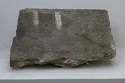 Der Grundstein (98 cm × 68 cm × 16 cm) lag bis zum Jahr 1864 unter dem Hochaltar und wurde beim Neubau des Kirchenschiffes im Jahr 1866 wieder unter den Stufen des Hochaltares eingemauert.[12] Er ist aufgrund einer Beschädigung durch Baggerarbeiten beim Abriss der neogotischen Kirche nur bruchstückhaft erhalten und befand sich zunächst im städtischen Museum. Seit 2018 ist er in einer Nische des rechten Seiteneinganges der Kirche ausgestellt.
