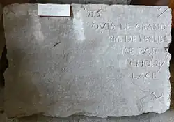 „16 + 85 AU NOM DE LOVIS LE GRAND CETTE PREMIERE PIERRE DE L’EGLISE DE SARRE-LOVIS A ÉTÉ MISE PAR MESSIRE THOMAS DE CHOISY GOVVERNEUR DE LA PLACE“