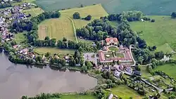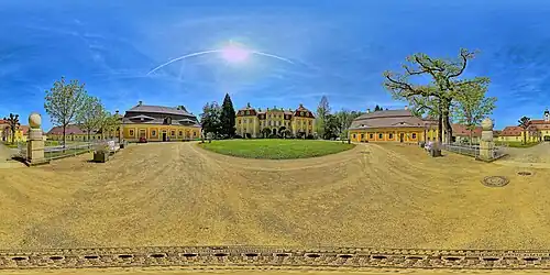Die Schlossanlage erreicht man durch das zweigeschossige Torhaus mit barockem Turmaufbau. Das Torhaus ist Teil des Wirtschafts- oder Meierhofes, dessen einstöckige Gebäude (ehemals Ställe und Lager) sich an das Torhaus anschließen. Der Wirtschaftshof wird von zwei Kavaliershäusern abgeschlossen, die zum Ehrenhof, dem Vorplatz des Hauptgebäudes, überleiten.