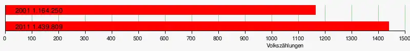 Die Bevölkerungszunahme zwischen 2001 und 2011 lag bei 23,67 % oder rund 276.000 Menschen. Die Entwicklung verdeutlicht folgende Tabelle: