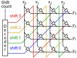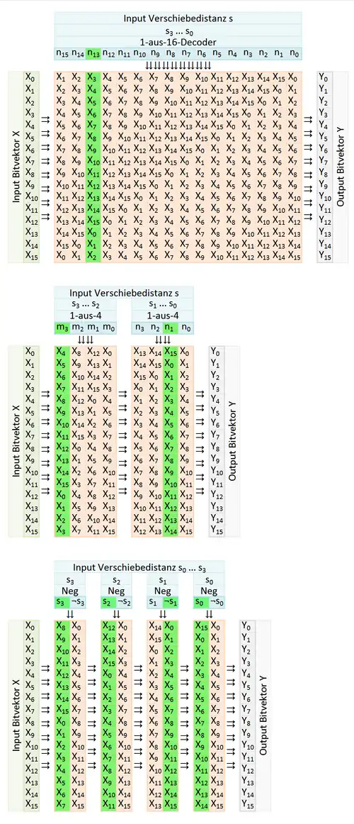Die N verschiedenen Verschiebeoperationen des N Bit langen Eingangs-Bitvektors werden als eine N×N-Matrix abgebildet. Die Verschiebedistanz, die als ein log2N Bit-Wert vorliegt, wird mit einem 1-aus-N-Decoder dekodiert und selektiert einen bestimmten Eingang aller N N-aus-1-Multiplexer.