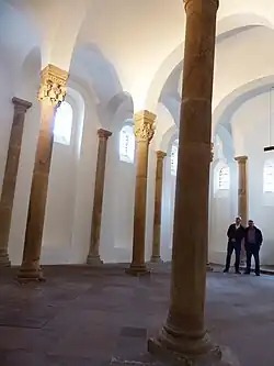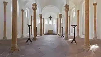 Die Halle innen ist als architektonische Idee in dieser Form gewollt und nicht technisch bedingt – durch darüber liegende Räume beispielsweise. Erst im 12. Jh. tritt die Halle als architektonisches Prinzip in einzelnen, weit auseinander liegenden Landschaften häufiger auf, in Regensburg, der Oberpfalz, im Poitou in Frankreich und in Westfalen. Die schlanken, fast zerbrechlich wirkenden Säulen haben keine Beziehung zur übrigen deutschen Baukunst dieser Zeit und stammen eindeutig aus dem byzantinischen Bereich. Wichtig ist der Kranz von hoch liegenden Fenstern: Das von dort einfallende Licht lässt den Raum zusammen mit den grazilen Säulen wie schwerelos wirken – sehr im Gegensatz zu der massiven Bauweise des deutschen Raumes zu jener Zeit.