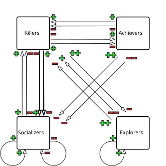 In diesem Diagramm werden die Abhängigkeitsverhältnisse der Spielergruppen dargestellt. Ein grünes Plus bedeutet steigende Userzahlen, ein rotes Minus steht für sinkende. Ein Pfeil mit einem Minus am Ursprung und ein Plus an der Spitze bedeutet, dass sinkenden Zahlen in der Box, von der der Pfeil kommt, zu steigenden Zahlen in der Zielbox führen. Das Gegenteil besagt ein Pfeil mit Plus am Ursprung und Minus an der Spitze; eine steigende Anzahl in der Box, von der der Pfeil kommt, resultiert in sinkenden Zahlen in der Zielbox. Ein doppeltes Minus bzw. Plus soll eine größere Änderung andeuten. Die Breite der Pfeile zeigt die Bedeutung des Effektes an. Beispielsweise resultiert die steigende Anzahl von Spielern in der Killer-Kategorie zu sinkender Population von Spielern mit Socializer Kategorie. Da der entsprechende Pfeil dick markiert ist, ist dieser Effekt dem Diagramm nach sehr stark ausgeprägt.[3]