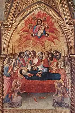 - Triptychon aus der Cappella delle Carceri in S. Francesco zu Montalcino, rechter Flügel: Abschied Mariä von den Aposteln und Tod Mariä, 1388, Holz, 175 × 58 cm.(siehe Bild)