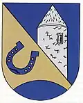 Blasonierung: „Im blau und golden schräggeteilten Wappenschild wächst aus der oberen Hälfte ein silberner Turm, unten ein schräggelegtes blaues Hufeisen, im Schildfuß ein blauer Berg.“[3] |