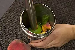 - Stößel (engl. muddler) (1. Bild Nr. 16): zum Zerdrücken von Kräutern, Früchten und anderen festen Zutaten im Shaker (fachsprachlich muddeln).