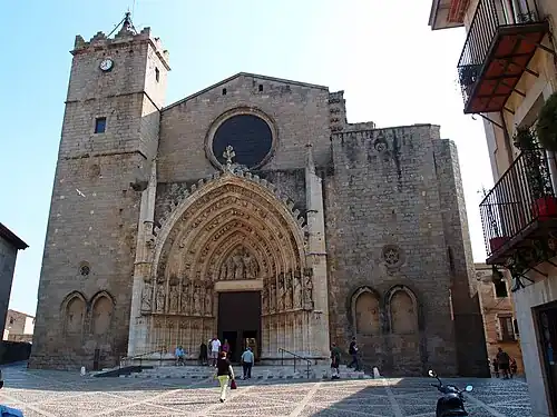 Die Basílica de Santa Maria ist ein imposantes Beispiel für die katalanische Gotik, die im Mittelalter von den Zisterziensermönchen in Katalonien eingeführt wurde. Sie zeichnet sich durch einen hallenartigen einheitlichen Innenraum aus, ohne klare Trennung zwischen Chor und Langhaus und, wie auch in diesem Fall, meist ohne Querschiff. Die Basílika verfügt über ein Zweiturmfassade mit einem aufwendig mit Figuren und Ornamenten verzierten Trichterportal aus Marmor und darüber einem großen Rosettenfenster. Der rechte Turm wurde nicht vollendet. An der linken Seite des Kirchenschiffs steht als dritter Turm der 36 Meter hohe fünfstöckige Glockenturm, der in Anlehnung an die damalige Architektur romanischer Glockentürme in der Lombardei gestaltet wurde; er stammt vermutlich aus dem 13. Jahrhundert.