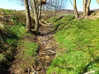 Er fließt zunächst in östliche Richtung durch ein enges bewaldetes kerbtal und dann durch Felder und Wiesen.