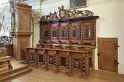 Das Chorgestühl aus der Zeit der Benediktiner-Mönche ist eine kostbare, schwere Schnitzarbeit mit gedrehten Säulchen, Muscheln und Fruchtgirlanden, die Abt Roman Wohlrab (1680–1699) anfertigen und mit seinem Wappen krönen ließ.[3] Ursprünglich befand es sich im Presbyterium und steht aktuell (2025) auf der Orgelempore.