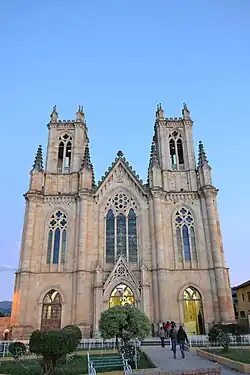Die dreischiffige Hallenkirche wurde im neugotischen Stil errichtet. Sie hat hinter der 27 Meter breiten Fassade eine Länge von 76 Metern. Die Decke des Mittelschiffs ist als flaches Tonnengewölbe ausgeführt, die der schmaleren Seitenschiffe eben. Die Kirchenschiffe sind mit Reihen von runden Säulen mit Kapitellen getrennt. Die Kirche ist mit Buntglasfenstern und einem Marmorboden ausgestattet. Der Hauptaltar ist von einem hohen Ziborium auf vier Säulen überdacht.[1] Ein vergleichbarer Baldachin steht in Kolumbien nur noch in der Kathedrale von Manizales. Um die Kirche wurde ein Park angelegt.