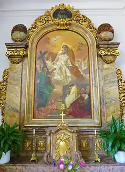 Für die im Jahr 1920 von Prälat Alois Echelmeyer eingerichtete Armseelenkapelle (ursprünglich Sakristei, dann Taufkapelle), die auch als Gedächtnisstätte für die im Ersten Weltkrieg gestorbenen Söhne der Pfarrei dienen sollte,[31] stifteten Arnold Becker (1853–1928) und Gertrud Becker, geb. Sinn (1860–1949) (Bekleidungshaus Sinn in der Saarbrücker Bahnhofstraße),[32] ein Altarbild. Anlass war der Soldatentod ihres jüngsten Sohnes Paul, der im Jahr 1915 im Alter von 19 Jahren bei den Kämpfen in Lothringen gefallen war. Maler des Altarbildes war der aus Fischach in Bayerisch-Schwaben stammende Leonhard Thoma, der sich durch die Ausstattung der St. Anna-Basilika in Altötting einen Namen gemacht hatte. Thomas St. Johanner Gemälde ist eine verkleinerte Kopie des Originals in der St. Anna-Basilika in Altötting („Altar des kostbaren Blutes“ in einer der rechten Seitenkapellen).[33] Das Bild in neobarockem Rahmen trägt den Titel Thron der Gnade und zeigt eine modifizierte Gnadenstuhl-Szene mit den Armen Seelen, die durch das Messopfer von ihren Fegefeuerqualen erlöst werden.