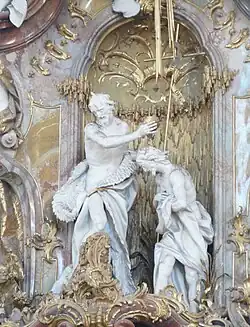 Der Barock-Bildhauer Wunibald Wagner schuf anbetende Engel, die das Tabernakel flankieren. Das Tabernakel ist von einem strahlenden vergoldeten Lichterkranz und Putti umgeben.