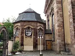 - ↑ Matthias Prinz und Hermann Josef Willger: Dokumentation Kath. Pfarrkirche St. Johann Saarbrücken erbaut von Friedrich Joachim Stengel 1754–1758, Renovation 1964–1975, hrsg. v. Kath. Pfarramt Saarbrücken-St. Johann, Saarbrücken 1975, S. 60.