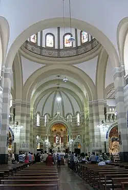 Die Kirche im neobyzantinischen Stil mit neoromanischen Anklängen erhielt eine Vierungskuppel auf einem Tambour, der Glockenturm erhebt sich rechts neben dem Chor. Das Innere der dreischiffigen Kirche ist reich verziert mit Buntglasfenstern, Mosaiken und farbigem Marmor, inspiriert durch den erneuernden Stil der Beuroner Kunstschule. Zwischen 1941 und 1942 wurde die Fassade von dem italienischen Architekten Ricardo Buffa umgestaltet, der auch den Hauptaltar entwarf.