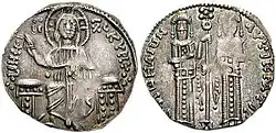 Das Basilikon wurde kurz vor 1304 von Kaiser Andronikos II. Palaiologos in direkter Nachahmung des venezianischen Silberdukaten oder Grosso eingeführt, hauptsächlich um die Söldner der katalanischen Kompanie zu bezahlen.[2][3][4] Die byzantinische Münze folgte eng der Ikonographie des venezianischen Vorbilds, mit einem sitzenden Christus auf der Vorderseite und den beiden stehenden Figuren von Andronikos II. und seinem Sohn und Mitkaiser Michael IX. Palaiologos anstelle von Markus und dem Dogen von Venedig auf der Rückseite. Die Ähnlichkeit wurde durch den Namen der neuen Münze verstärkt: Aus dem Ducato, der „Münze des Dogen“, wurde das Basilikon, die „Münze des Basileus“, obwohl die zeitgenössischen griechischen Quellen beide meist Doukaton nennen.[4]