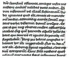 - „Bastard Anglicana“: Eine ab der Mitte des 14. Jahrhunderts von englischen Schreibern für anspruchsvollere Codices entwickelte Schrift. Sie verbindet Elemente der Textura, darunter das doppelstöckige a, mit Eigenschaften der „Anglicana“, der in England gebräuchlichen spätmittelalterlichen kursiven Gebrauchsschrift. Die Bastard Anglicana wurde für Prachthandschriften und als Auszeichnungsschrift verwendet. Damit übernahm sie Funktionen der Textura, deren Verwendung relativ unbequem war.[19]